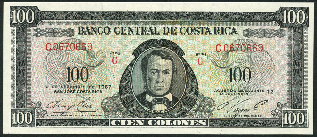 Banco Central de Costa Rica, 100 colones, 6 December 1967, serial number C 0670669, dark grey and multicolour, portrait J F Mora in ornate circular frame flanked by value at centre, pretty border with value at each corner and low centre, reverse, monument at centre, elaborate patterns and border around