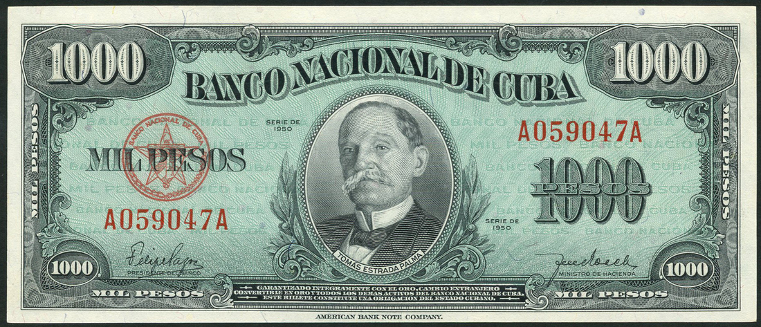 Banco Nacional de Cuba, a group of notes comprising, 1 peso, 1960, serial number G 071012 A, 5 pesos, 1949, serial number P 928427 A, 10 pesos, 1960, serial number D 675136 A, 20 pesos, 1960, serial number P 342614 A, 100 pesos, 1954, serial number B 555592 A, 1000 pesos, 1950, serial number A 059047 A, 1 peso, 1953, serial number B 381415 A, and 5 pesos, 1960, serial number E 352287 A