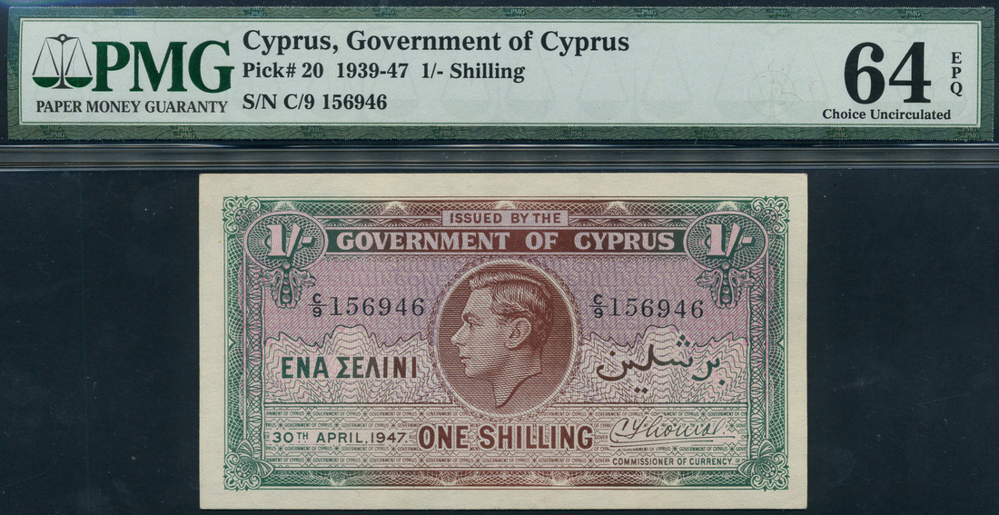 Government of Cyprus, 1/-, 30 April 1947, serial number C/9 156946, green, brown and purple, King George VI at centre, reverse red, green and blue,