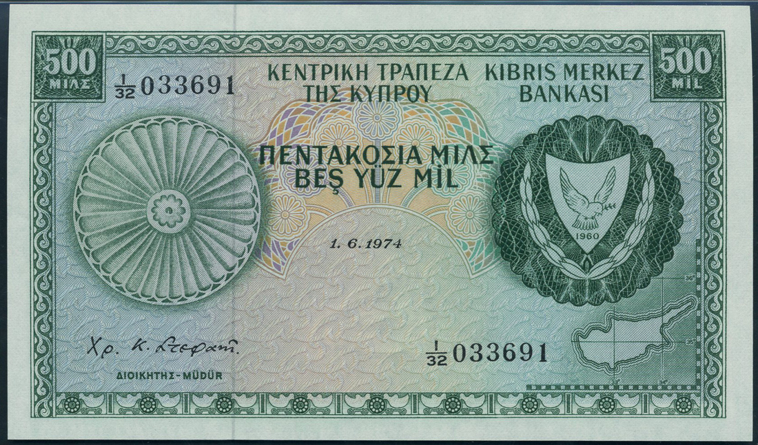 Central Bank of Cyprus, 250 mils, 1 June 1974, serial number K/43 056057, 500 mils (2), 1 June 1974, serial numbers I/32 033691 and N/51 212868