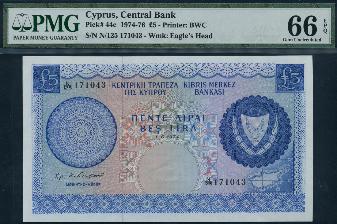Central Bank of Cyprus, £1, 1 May 1973, serial number H/60 126038, brown on multicolour, £5, 1 June 1974, serial number N/125 171043, blue on multicolour, coat of arms at right