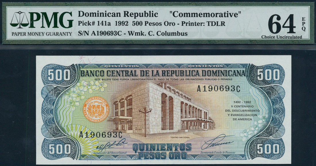 Banco Central De La Republica Dominicana, 500 pesos, 1992, serial number A190693C, blue on multicolour, coat of arms at left, National theatre in Santo Domingo at centre, reverse blue, fortress 'San Felipe' at centre right