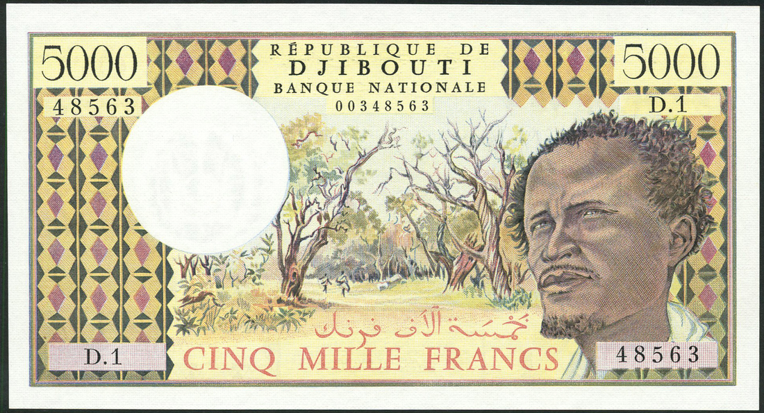 Banque Nationale de Djibouti, 500 francs, 1979, serial number B.1 20444, and 5000 francs, 1979, serial number D.1 00348563