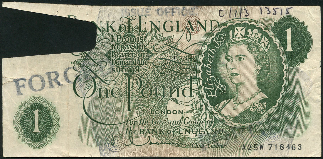 Bank of England, J Q Hollom, forged £1, ND, serial number A25W 718463, green, portrait Queen Elizabeth II in ornate circular frame at right, value in green tablets low left and top right, reverse, seated Britannia