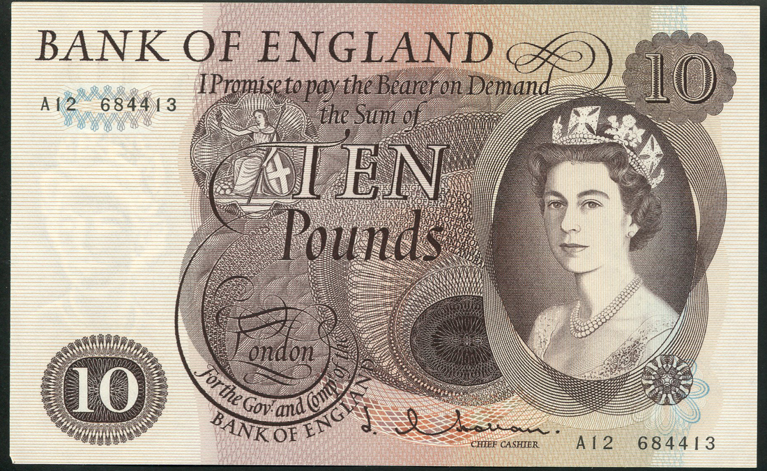 Bank of England, J Q Hollom, £10, ND (1964), serial number A12, J S Forde, £10, ND (1967), serial number A83 215415, J B Page, ND (1971), serial number B75 322854, brown and multicolour, portrait Queen Elizabeth II at right, seated Britannia centre left, reverse, lion with key