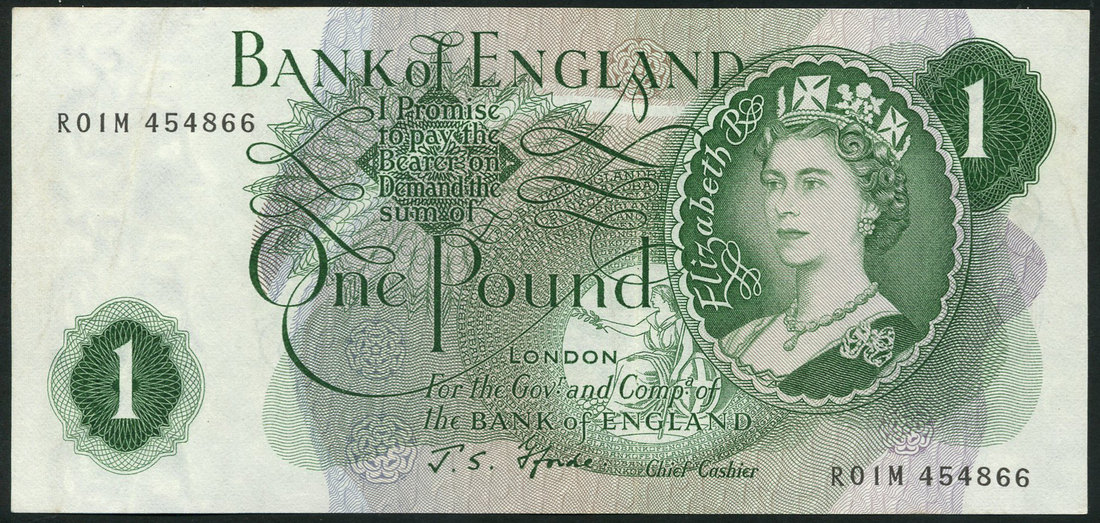 Bank of England, J S Fforde, £1, ND (1967), serial number R01M 454866, green, Elizabeth II at right, Britannia right centre
