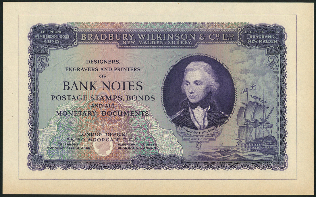 Bradbury Wilkinson & Company Limited, an advertising note for 'Banknotes, Postage Stamps, Bonds and all Monetary Documents', purple on multicolour underprint, Nelson at centre right, HMS Victory below,