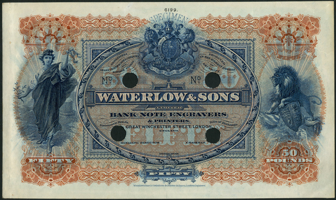 Waterlow & Sons Limited, a specimen/colour trial advertising note for 50 pounds, no date, signatures or serial numbers blue and red-brown, arms at top centre, lion and shield at right, female allegory at left, reverse blue, woman's head at centre, four cancellation holes