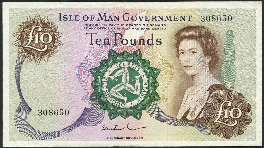 Isle of Man Government, £10 (2), ND (1975), serial numbers 178184, 308650, signature Paul, brown and dark green on multicoloured underprint, portrait of Queen Elizabeth II by Anthony Buckley at right, triskeles at centre, reverse brown and orange, Peel Castle