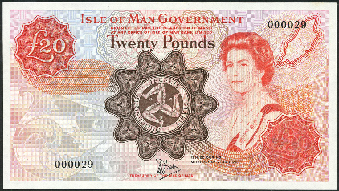 Isle of Man Government, £20, ND (1979), serial number 000029, signature Dawson, scarlet, brown and multicoloured, portrait of Queen Elizabeth II by Anthony Buckley at right, triskeles at centre, overprinted "ISSUED DURING MILLENNIUM YEAR 1979", reverse inauguration of Laxey Wheel in 1854