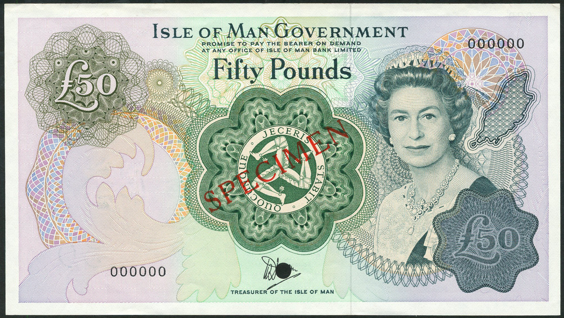Isle of Man Government, specimen £50, ND (1983), serial number 000000, signature Dawson, green and multicoloured, silver jubilee portrait of Queen Elizabeth II by Peter Grugeon at right, triskeles at centre, reverse view of Douglas Bay, overprinted SPECIMEN diagonally in red on obverse and reverse, one punch hole