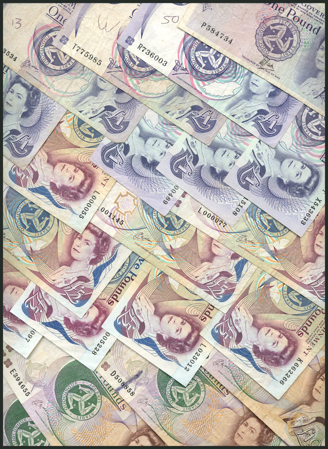 Isle of Man Government, a group of notes comprising £1, ND (1980), signature Dawson; £1 (3), ND (1990), signature Dawson; £1 (3), ND (1992), signature Cashen; £1, ND (2009), signature Shimmin; £5 (8), ND (c.2001), signature Cashen; £10 (6), ND (1991) and £10 (4), ND (2002), all signature Cashen; £10 (5), ND (2006-11), signature Shimmin, all portrait of Queen Elizabeth II by Anthony Buckley at right, triskeles at centre