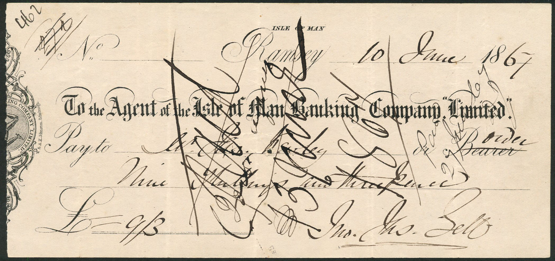 Isle of Man Banks, a group of cheques, comprising The Agent of the Isle of Man Banking Company Limited (3), Ramsey, 10 June 1867, in the sum of £-9/3; 14 August 1872, in the sum of £5; 30 April 1874, in the sum of £3, all marked "Paid"; Westminster Bank Limited, Douglas, 29 August 1948, in the sum of £2-5-3, pink and white, marked "PAID"; Barclays Bank Limited, unissued, Douglas, 19-, green; Liverpool Trustee Savings Bank, unissued with counterfoil, Douglas, 19-, pink and white, Isle of Man Bank Limited (4), all different designs, one issued from Castletown, the remainder from Douglas; Martins Bank Limited (2), Douglas, one buff, one green