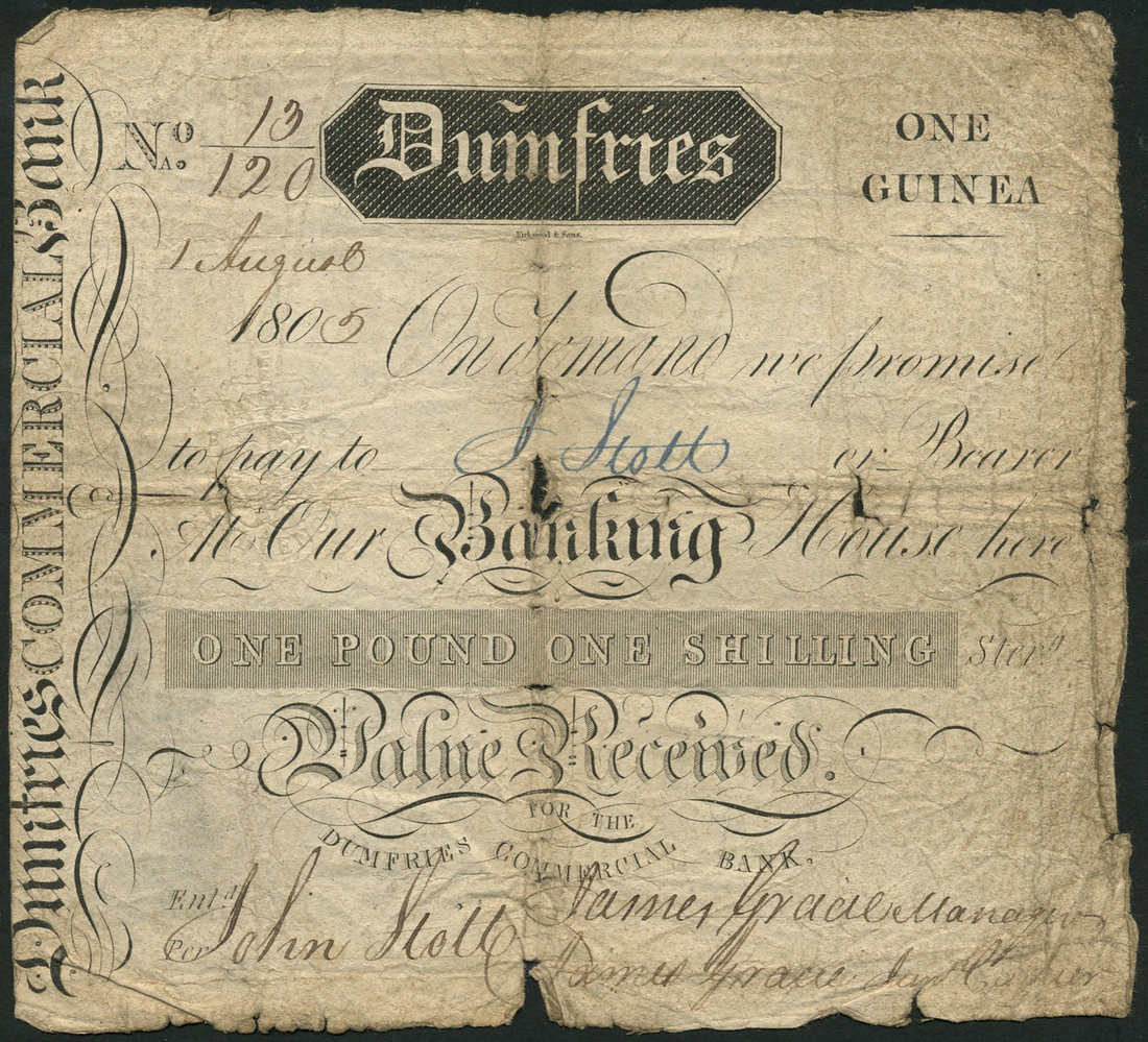 Dumfries Commercial Bank, 1 guinea, 1 August 1805, serial number 13/120 black and white, three manuscript signatures below