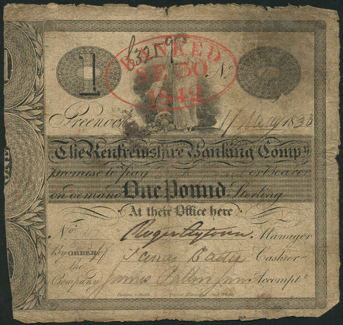 Renfrewshire Banking Company, £5 (2) Greenock, 1833 serial number 41/828, 18(29?) serial number 3/1308 £1, 1938, serial number 117/828, black and white, arms and maidens respectively top centre, three manuscript signatures below, red oval RANKED handstamp in top centre field