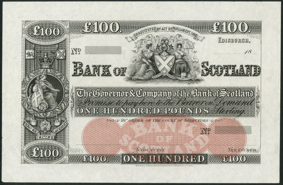 (†) Bank of Scotland, specimen uniface obverse proof £100, Edinburgh, 18xx (ca 1851), no serial numbers, no signatures, black and pink, crowned Scotia in decorated circle at left, arms of the bank at upper centre, value in each corner