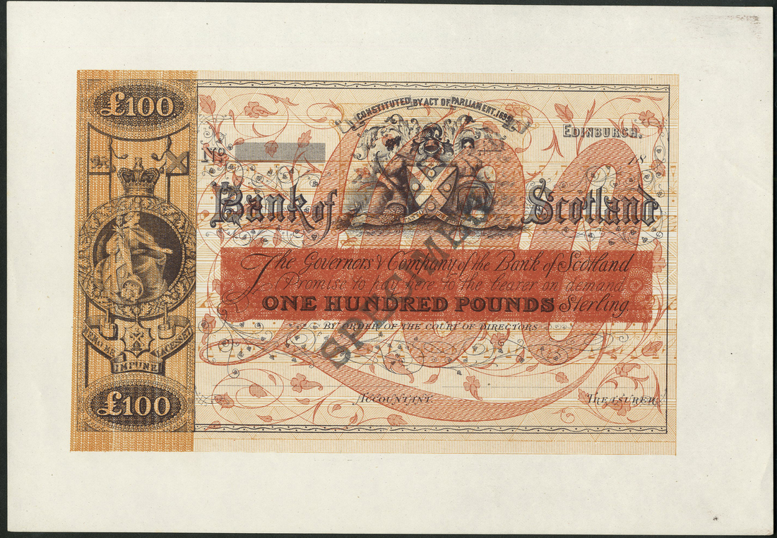 Bank of Scotland, printer's proof for £100, ND, no serial number, uniface, brown, red and tan, Scotia in ornate frame at left, arms at top centre, value in red tablet at centre and upper and lower left, black SPECIMEN handstamp
