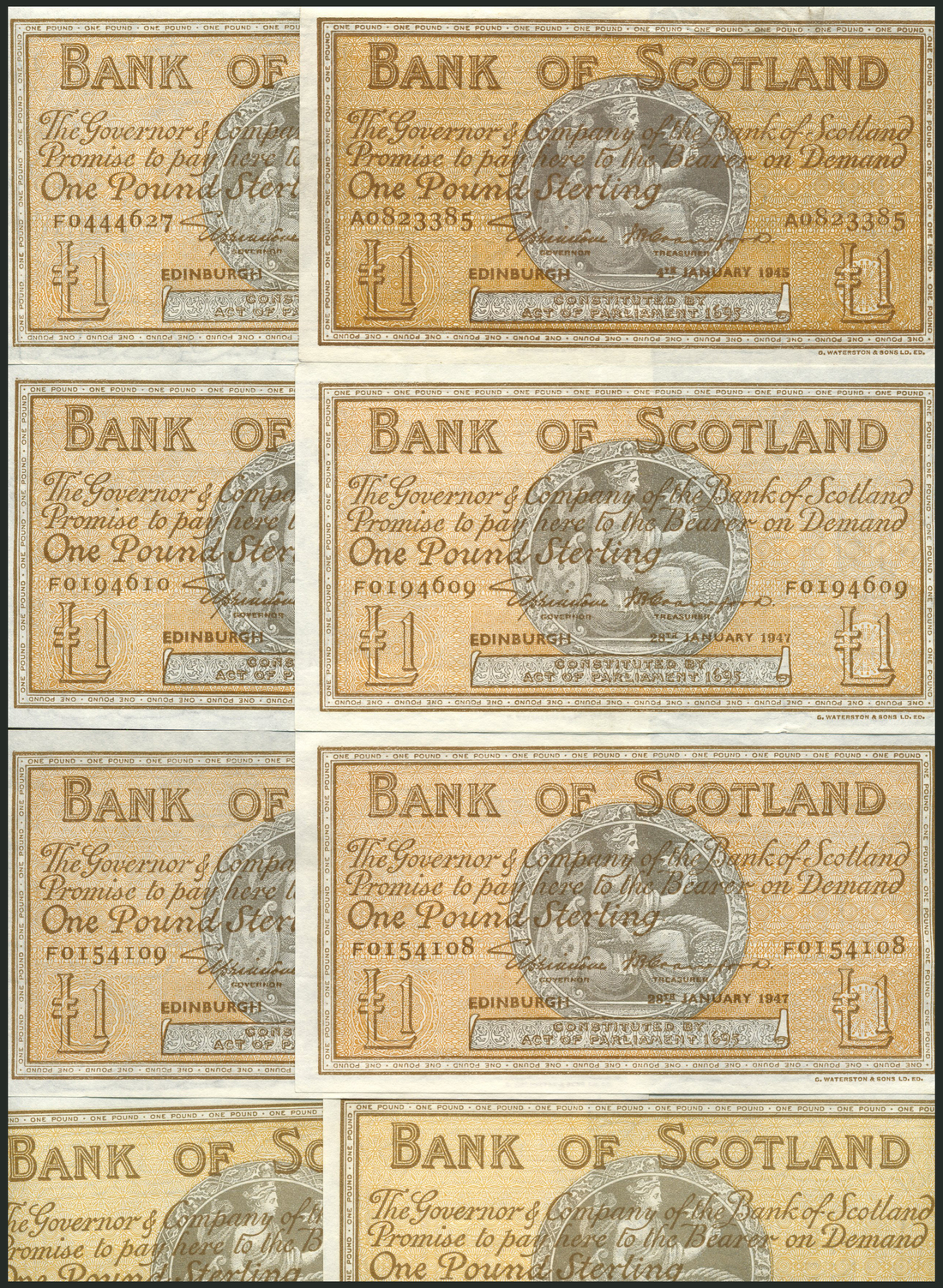 Bank of Scotland, £1 (9), comprising dates 1945 (1), 1947 (5) and 1951 (3), brown and grey, value at low left and right, medallion at centre, reverse brown, arms at centre