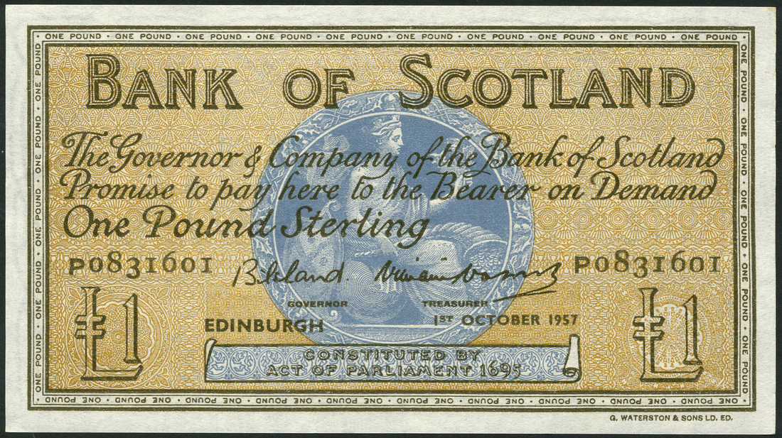 Bank of Scotland, £1 (12), 1 October 1957, serial numbers from the range P083601-19, brown, tan and blue, value at low left and right, medallion at centre, reverse brown, ship at centre