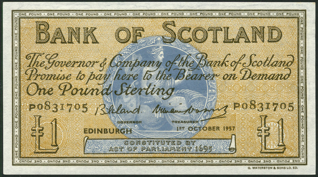 Bank of Scotland, £1 (19), 1 October 1957, serial numbers P0831705-23, brown, tan and blue, value at low left and right, medallion at centre, reverse brown, ship at centre