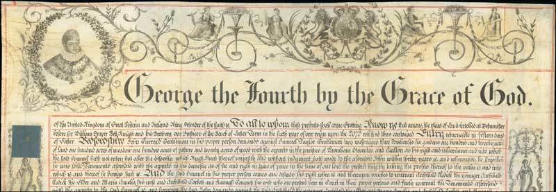 1825 (16 May) Exemplification of Common Recovery in English in a very neat hand on vellum featuring a portrait of the King with coat of arms and female allegorical figures, a second, smaller portrait is in the left illustrated margin. By John Garrard from Samuel Taylor of 2 messuages, 3 dovecotes, 6 gardens, 120 acres land, 100 acres meadow, 100 acres pasture and 20 acres wood in Lavenham, Steventon and Carlton in Bedfordshire (now Lavendon and Stevington) Bearing seal of Court of Common Pleas at foot (broken but largely complete, no clear impression) and £3 blue general duty stamp. Photo