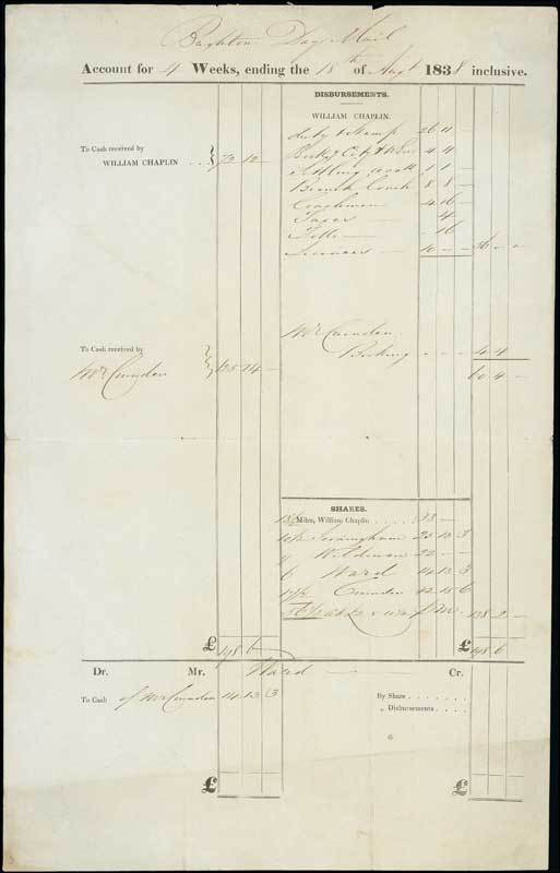1831 (18 August) printed sheet with the accounts for four weeks. This shows that Chaplin, at the London Coaching Inn, booked fares value £72.12.0d. and incurred £56 expenses (of which £26.11.0d was tax). In Brighton Mr. Crunden took £125.14.0d in fares and had £4 in expenses. The combined profit was shared amongst the various innkeepers who horsed the coach on the Brighton road. William Chaplin was probably the most important of the great stage coach proprietors, with four major coaching inns and a stud of over 400 horses. Black printing with manuscript annotations, size 10½" x 16½". A few folding creases, fresh. Unusual. Photo