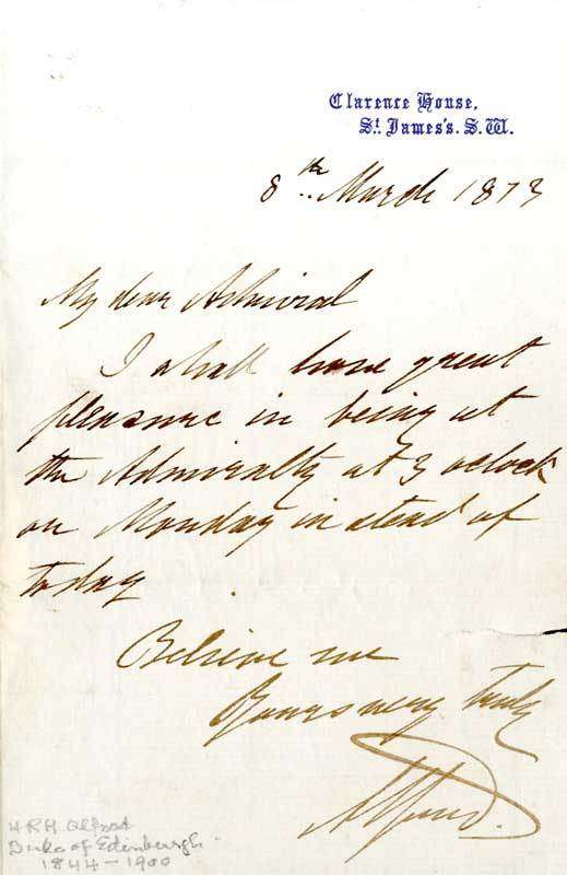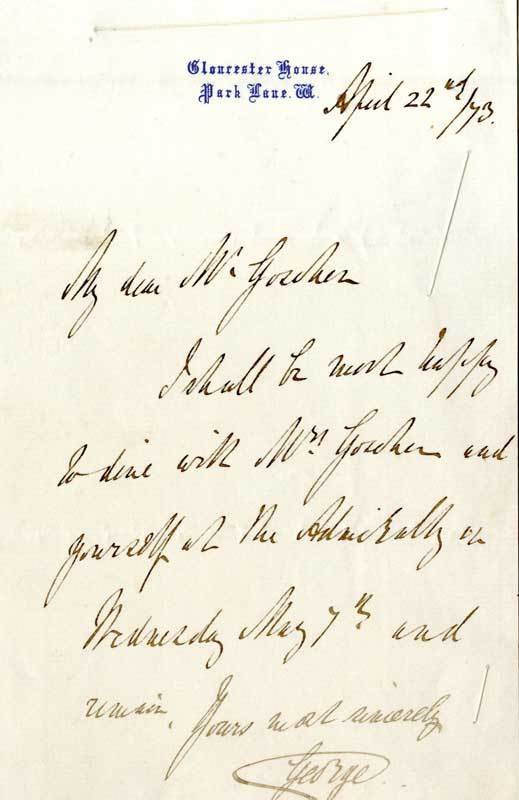 1845-1902, an autograph book belonging to the 1st Viscount Goschen, many complete letters including Marquess Camden (1845), 1867 ALS from Henry d'Orleans (youngest son of King Louis Philippe of France) from York House, Twickenham; 1871 ALS from the Duke of Argyll on India Office stationery; 1873 ALS from George Duke of Cambridge from Gloucester House; 1873 ALS from Alfred Duke of Edinburgh from Clarence house to Admiral Sir John Tarleton with hand delivered envelope; 1875 Lord Rippon (2 ALS); 1880 stationery card ALS by Harriet Eleanor Hamilton Kong (poet); 1882 ALS from George Augustus Simcox (scholar and poet); 1883 Charlotte Mary Yonge (novellist) with envelope; 1887 stationery card reputedly ALS by William Morris; 1902 Lord Roberts on War Office stationery; also undated Dorothea Irving (Lady Brunner), actress; Andrew Lang, poet (2, one with envelope). A very interesting selection. Photo