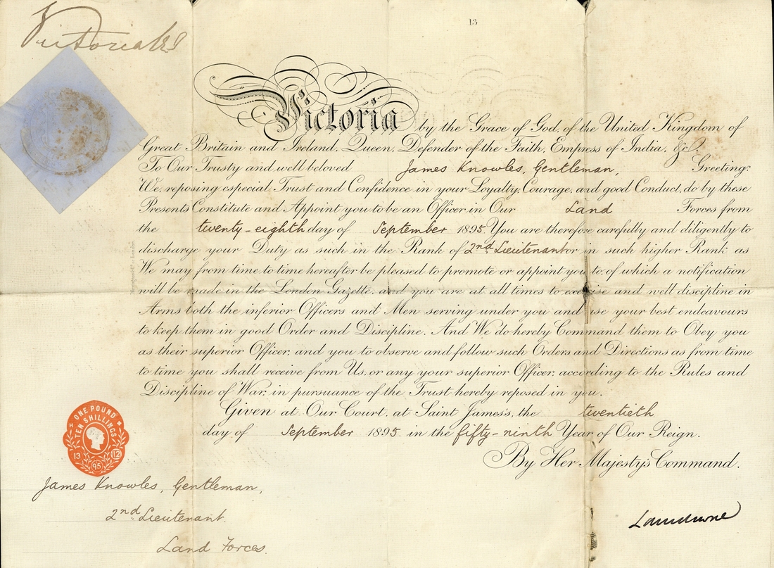 1895 (28 September) a commission to James Knowles signed at top "Victoria R.I." and "Lansdowne" at foot, with £1.10 revenue stamp, heavily creased with some splitting and soiling. Also 1915 (26 March) commission to Pinero Jerome Brickwell signed at top "George R.I."; creased an soiled. (2)