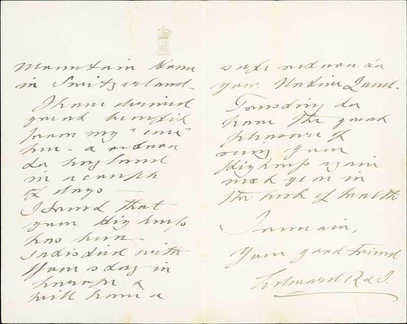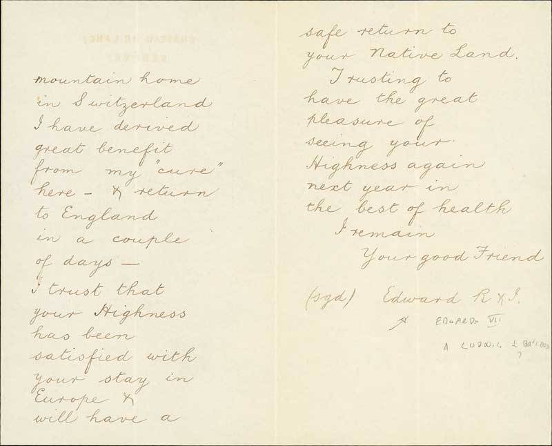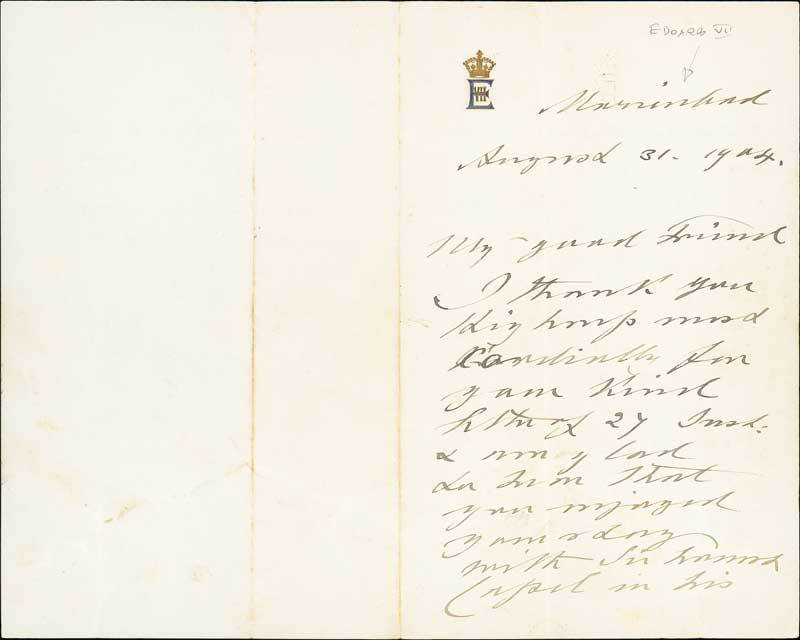 1904 (31 August) autograph letter to the Khedive of Egypt in Divonne-les-Bains in France, written on his gold and blue monogrammed paper whilst he was in Marienbad in Austria, and includes, " ... am glad to hear that you enjoyed your stay with Sir Ernest Cassel in his mountain home in Switzerland. I have derived great benefit from my "cure" here ..." and signed, "Your good Friend Edward R&I". With the original envelope which bears a complete red wax seal with the Royal crest (light soiling). Very scarce. Photo