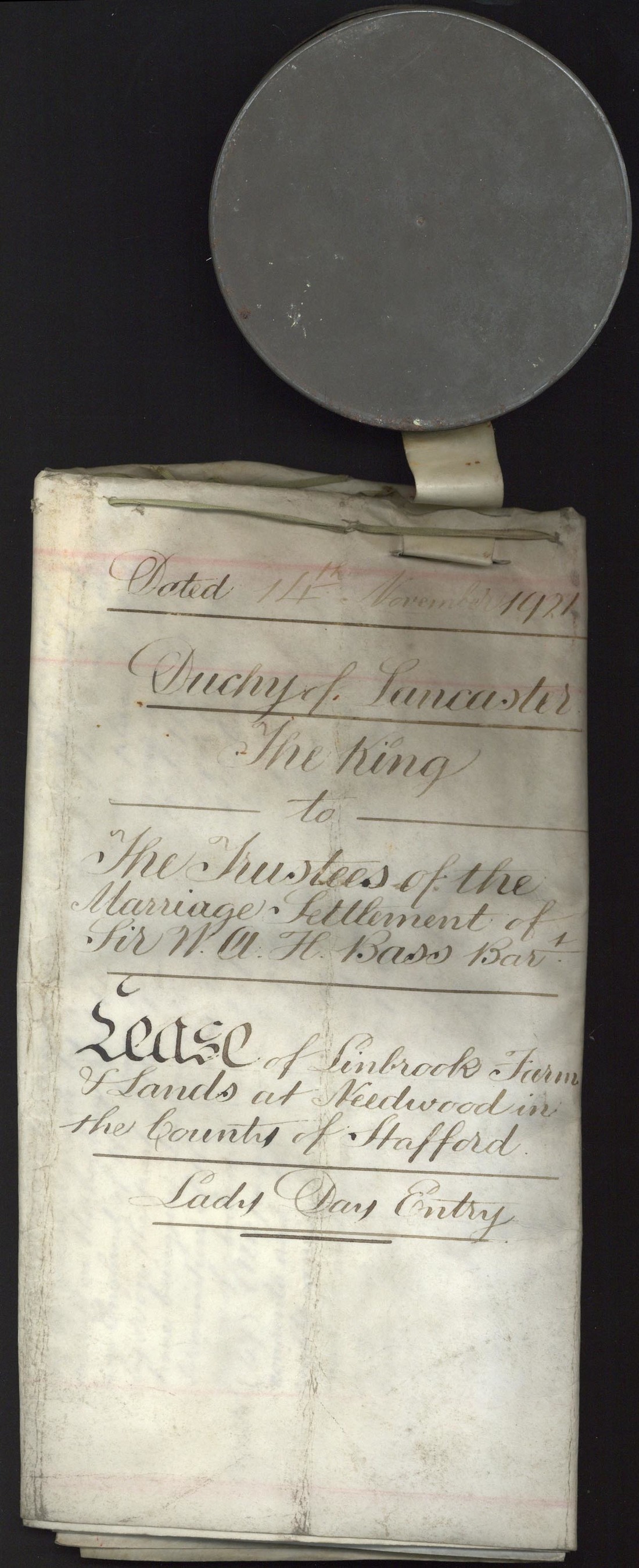 1921 (14 November) Royal Lease between the Duchy of Lancaster, The King to the Trustees of the Marriage Settlement of Sir William Bass a lease of Linbrook Farm and lands at Needwood in the County of Stafford. Signed by the trustees, one of whom was the Earl of Huntington. Includes a map of the property and a schedule of the lands (over 110 acres), the field system which survives today. With seal and complete impression of the Seal of King George V for the Duchy of Lancaster, in dark red wax with tin skippet