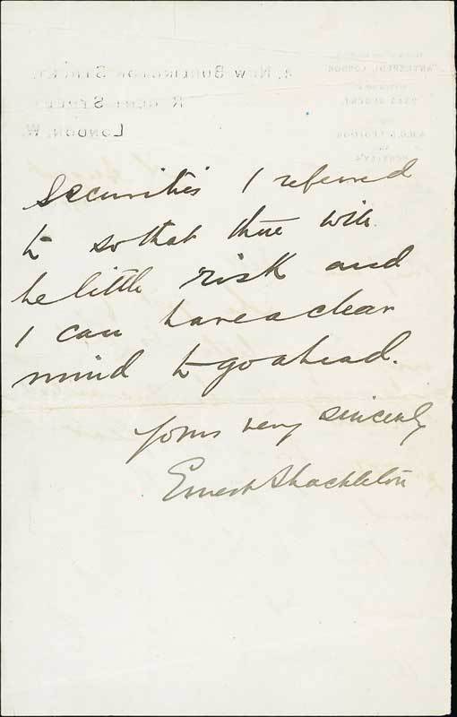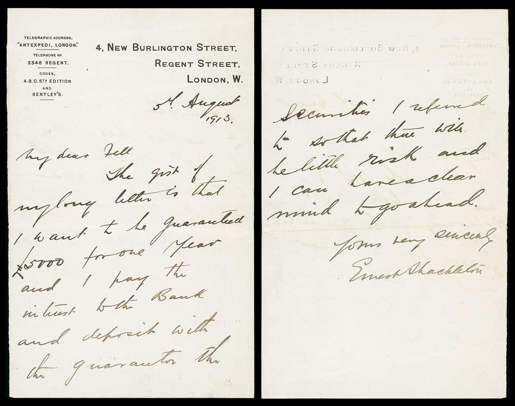 "The gist of my long letter is that I want to be guaranteed £5000 for one year and I pay the interest to the Bank and deposit with the guarantors the securities I referred to so that there will be little risk and I can have and clear mind to go ahead ... Ernest Shackleton". Central and other folds plus small paper split at top.