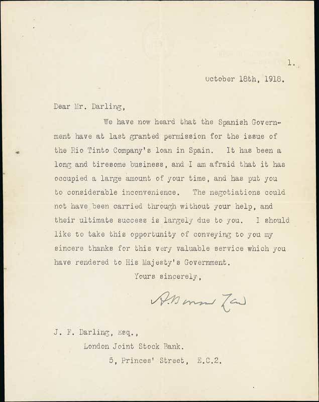 The first dated 18th October is a typewritten letter signed "A. Bonar Law" (later Prime Minister), "We have now heard that the Spanish Government have at last granted permission for the issue of the Rio Tinto Company's loan in Spain. It has been a long and tiresome business ...The negotiations could not have been carried through without your help."