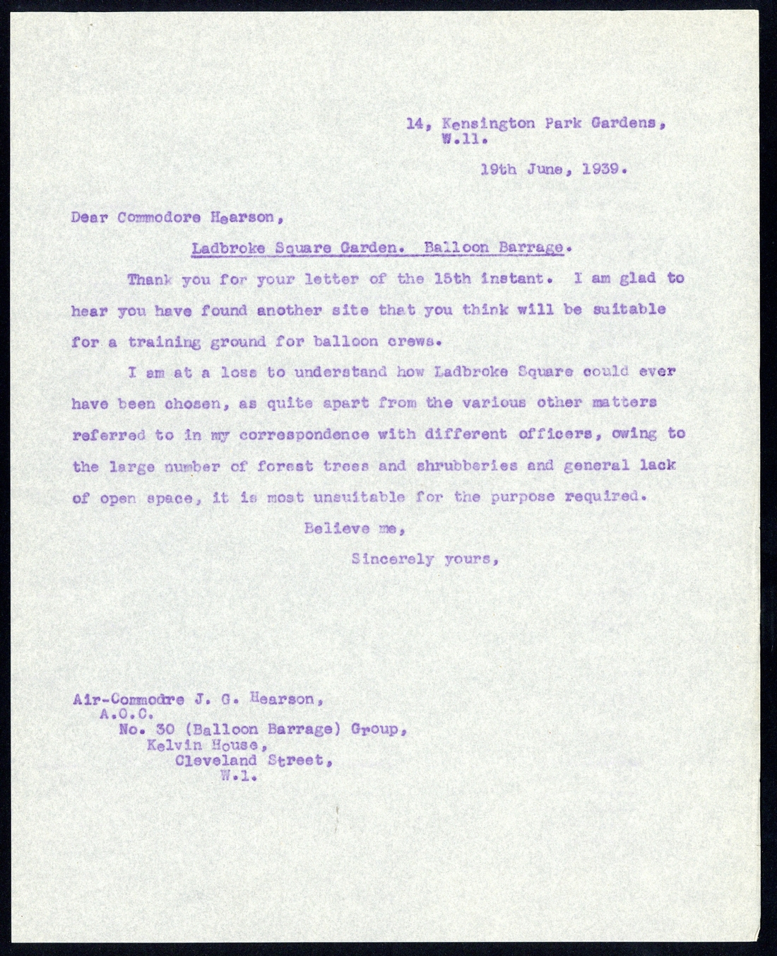 1939-40, a file of correspondence Sir William Davidson, M.P. relating to the London Balloon Barrage Section of the Royal Air Force fixing a balloon in Ladbroke Square Garden. A detailed compilation with top copies and duplicates, some signed, and includes problems associated with the removal of trees (instead of just lopping), claims for compensation for damage to property, the keeping of chickens for the unit. A wonderful insight into the problems on the ground of setting up these defensive units. Apparently this Garden was considered by the locals as a particularly poor choice as it was well wooded, not apparent from a scan of an Ordnance Survey map