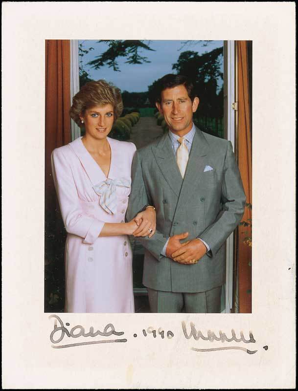 1990 presentation cabinet photograph of the couple standing in front of a door (at Highgrove House?) in the green Morocco leather frame with the the Prince's crest in the domed top. Signed on the mount "Diana" "1990" and "Charles". Very fine. Photo