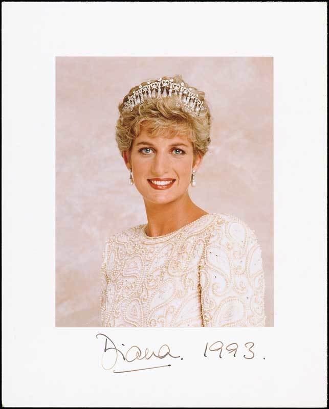 1993, presentation cabinet photograph, mounted on card and in the special domed black Morocco leather frame with "D" under crown at top. Signed "Diana 1993" in ink. This official photograph shows the princess wearing her tiara and is one of the portraits which appeared on the set of stamps. Very fine and rare with the frame. Photo