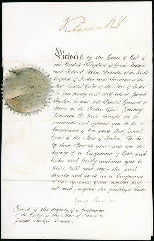 1896 (7 September) grant of award of the Companion of the Most Exalted Order of the Star of India to Joseph Parker, signed at top "Victoria R.I." and at foot by "George Hamilton"; the wafer seal is cracked and the usual three horizontal folds. Also the letter from the College of Arms with the Statutes and original envelope. A good group. Photo