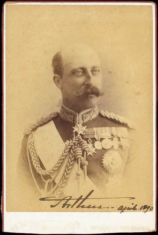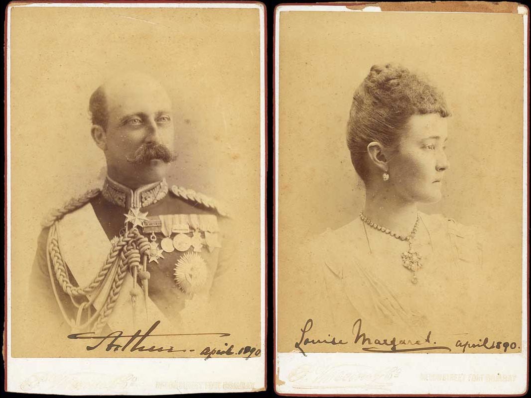 Arthur (Duke of Connaught) and his wife Louise; a fine pair of cabinet photographs by Puccino & Co. Bombay, each signed and dated "April 1890", showing them both head and shoulders, she is in profile and he is wearing his uniform and medals, 6 " x 4 ", Bombay. Scarce portraits prepared for the forthcoming Durbar. Photo