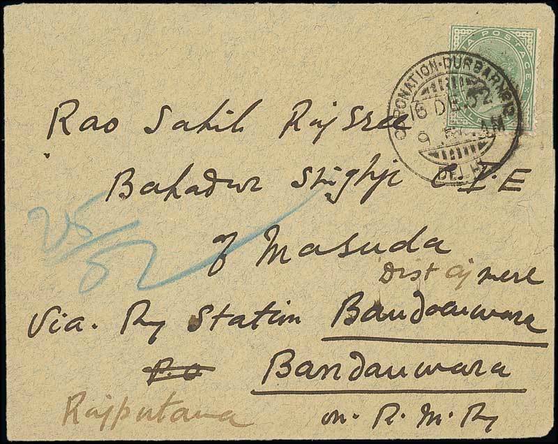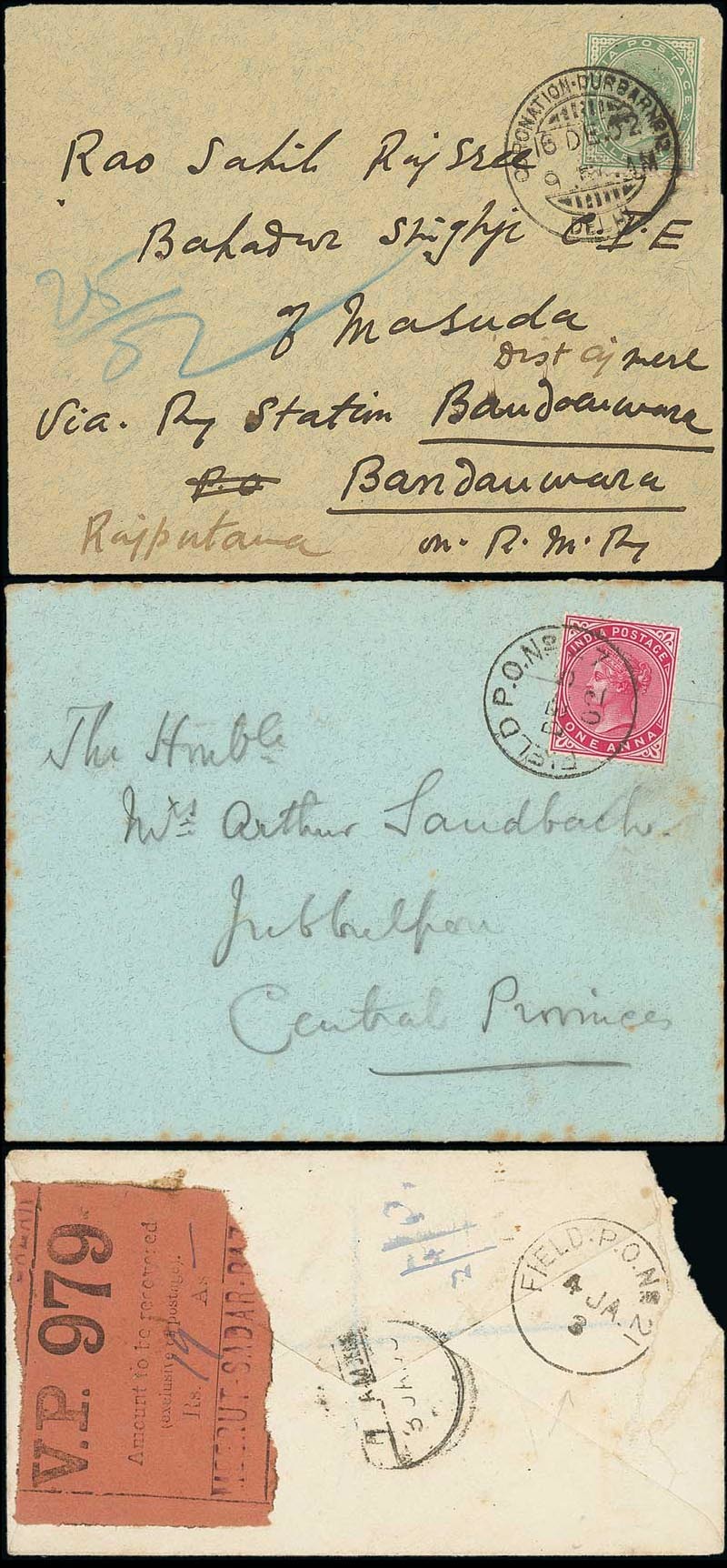 A specialised collection focussing on the special postmarks associated with this event with covers cancelled by F.P.O. 27 (Camp Panipal), F.P.O. No.13 (Camp Larauli), F.P.O. No.31, F.P.O No.12 (Camp near Humayon's Tomb), F.P.O. No.35 (Camp near old Fort Indrapal); Coronation Durbar c.d.s. on Q.V. values to 5r. (2), Durbar Central Head Post Office (Alipur Road) special c.d.s. (5 covers), Coronation Durbar No.1 (Viceroy's Camp), No.2 (Punjab Government Camp), No.5 (Commander In-Chief's Camp), No.6 (Visitor's Camp), No.7 (2, Viceroy's Escort Camp), No.12 (Central India Chief's Camp), No.14 (3, Maiden's Hotel) and No.21 (Fifth and Seventh Infantry Brigades) plus other examples used on piece and further related items and information. A remarkable lot. Photo