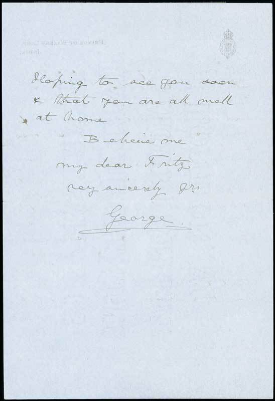 "with much regret, where we spent a delightful & most interesting time. We certainly had very hard work, but if our visit has been a success & it has done some good we are amply rewarded. I think what Sir H. Fowler said about Curzon is quite correct. He may have done some good things but he also made a great number of mistakes & certainly was one of the most unpopular Viceroys India has had for years. Wait till we meet & I can tell you a lot about it. One of his greatest mistakes was his speech at Bombay just before we left + his letter to the Times was about as bad. Hoping to see you soon & that you are all well at home. Believe me my dear Fritz very sincerely yrs George".