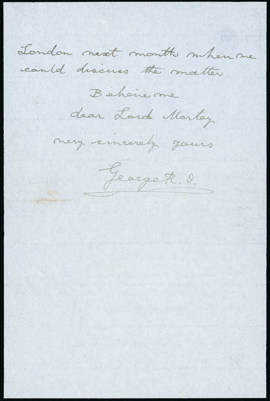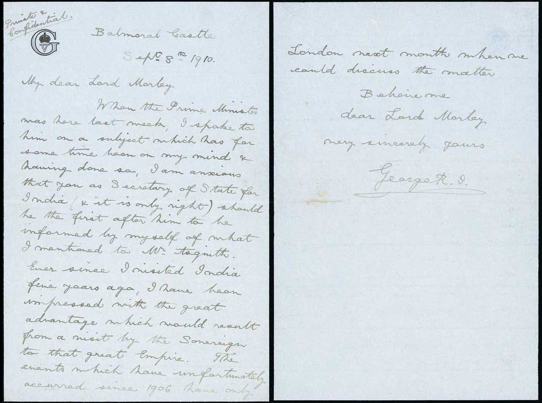 In this letter, the King writes, " ... I mentioned to Mr Asquith. Ever since I visited India five years ago, I have been impressed with the great advantage which would result from a visit by the Sovereign to that great Empire ... I am convinced where it is possible for me, accompanied by the Queen, to go to India & old a Coronation Durbar at Delhi, where we should meet all the Princes, Officials & vast numbers of people, the greatest benefits would accrue to the Country at large... I feel confident that my Ministers ... will appreciate my motives, which are actuated by a deep sense of duty & by my sympathetic interests in the Peoples of India ... I should like to hold the Durbar in January 1st 1913." signed "George R.I."