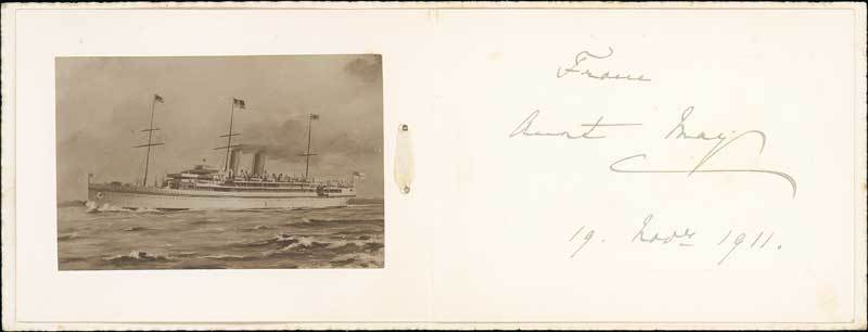 1911 (19 November) greetings card signed by Queen Mary. With photograph of H.M.S. Medina inscribed "From Aunt Mary" and dated. Written on passage between Gibraltar and Port Said. Unusual. Photo