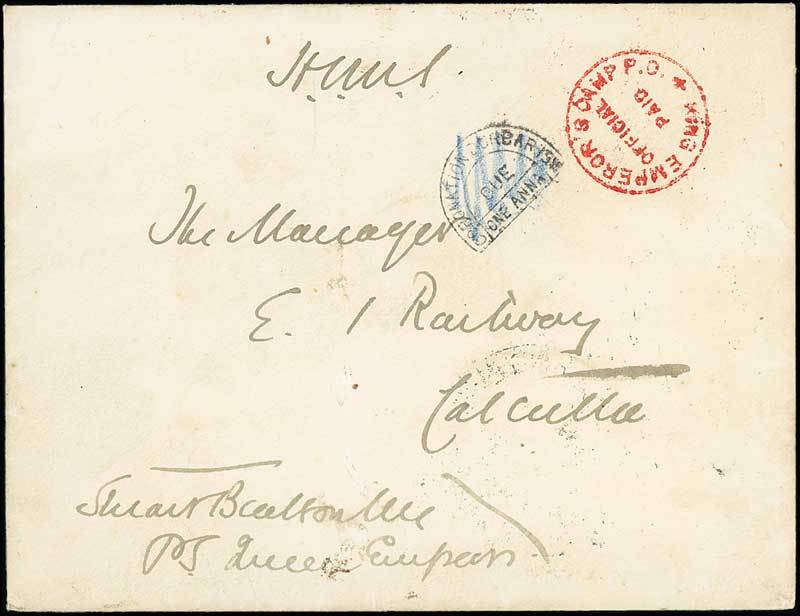 King Emperor's Camp: "H.M.S." envelope from Stuart Beatson, Private Secretary to the Queen Empress, to the Manager of the East India Railway, Calcutta bearing a fine strike of the very rare "king emperor's camp p.o./official/paid" circular handstamp in red with "coronation durbar/due/one anna" semi-circular handstamp in black alongside which has been crossed through in blue crayon, the reverse with the large King Emperor's Camp postmark with royal cypher and part Calcutta c.d.s. A fine and important cover. Photo