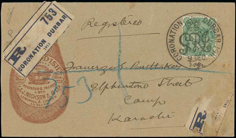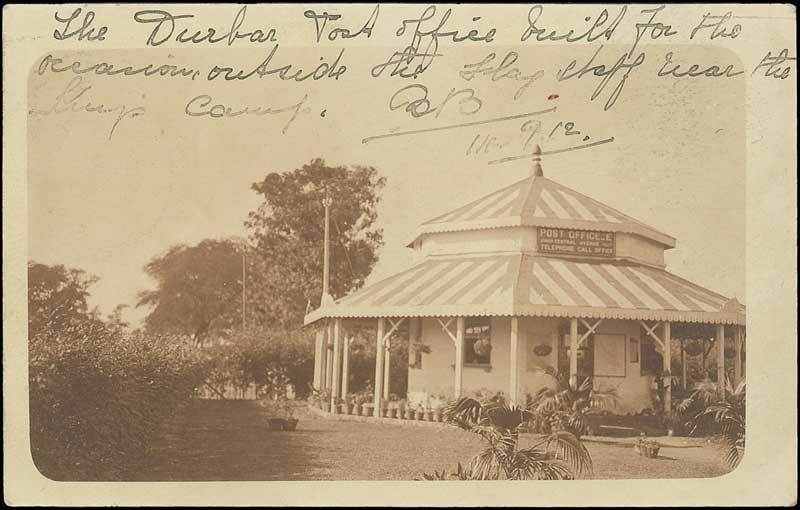 An extensive study collection in two volumes with a wide range of the different postmarks and other related material commencing with picture post cards of the Royal yacht 'Medina' (2), a blank Coronation menu card, two letters of thanks to the Dowager Rani of Dewas, Old Bombay Exhibition postmark (2 covers), Clubland Pass and postcards; an important collection of the different Durbar cypher postmarks with the Coronation Durbar machine cancel and c.d.s., breakfast and dinner menus for Christmas day and Boxing day 1911, registered mail (4); King Emperor's Camp Post Office A (Delhi) with covers, picture post cards (2) and stamped note paper; the sub offices with covers of "A" Kashmir Gate (4) including registered, "B" Mori Gate on telegraph receipt, "E" Central Avenue (5) including registered and photo card of the post office, "F" Polo Ground (3), "K" Pembari Bridge, "L" Azadpur, "M" The Ridge (2) including an important O.H.M.S. envelope and letter from the President of the Coronation Durbar Committee, "1" Badli ki Sarai, "2" Cavalry Camp Station (2), "3" Horseshoe Jhil, "4" Amphitheatre, "5" Jhurauda with small crown and cypher (3), "6" The Island, "7" Wazirabad Road, "9" The Mall (3), "12" Dhaka (2).