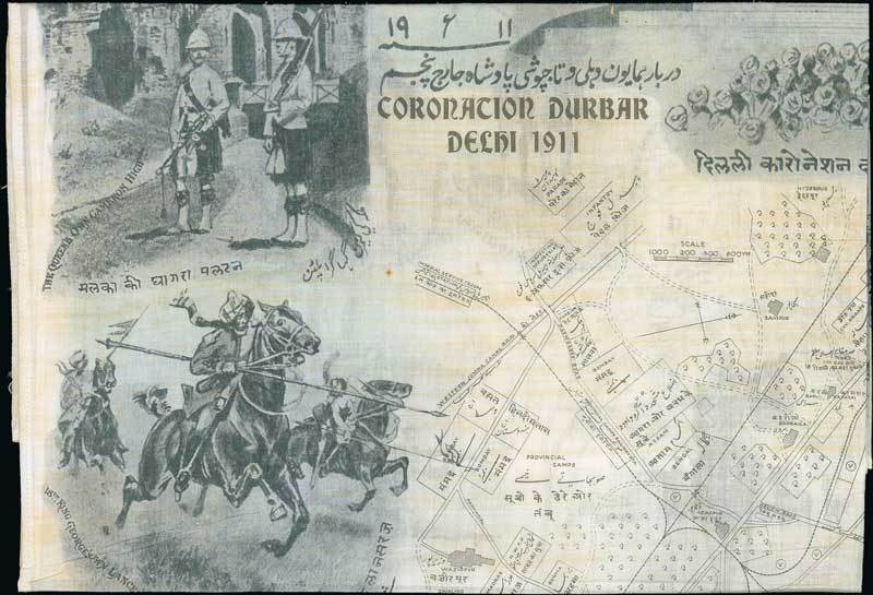 1911 (14 December) King George's Own Baluchis envelope to Miss Mary Simpson bearing 1a. adhesive tied by the large Coronation Durbar Royal cypher c.d.s. with the original enclosure of a fine silk scarf printed with the Coronation Durbar Delhi 1911 featuring a map and various vignettes; fine. Photo