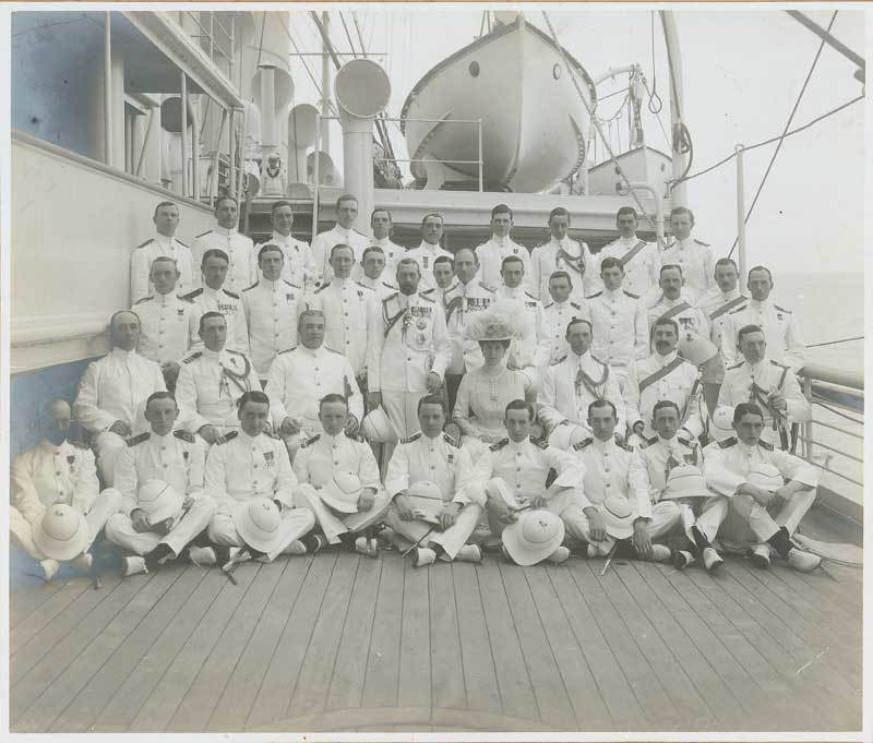 H.M.S. 'Medina': 1912 photograph of the King and Queen with the ships company, 11¼ x9½ inches, mounted on card. Fine. Photo