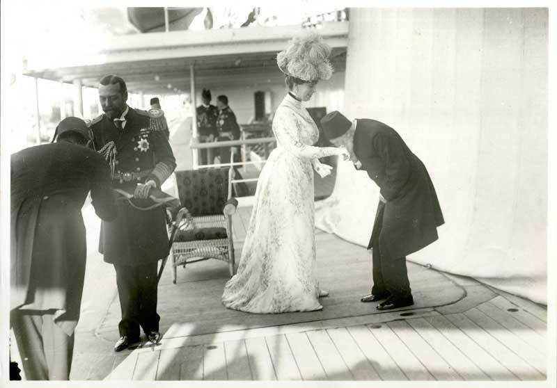 Commander George Tomlin of the 'Medina', his scrapbook and archive. An exceptional and detailed record of the travels of the 'Medina' carrying the King and Queen to India and back with newspaper cuttings, annotations of the commander's observations, Meteorological Office telegram and naval signals, several menu cards. An album of photographs including some of Commander Tomlin's personal pictures, photocards by Oscar Owers and a wide range by professional photographers, several of which were used by the press or for making post cards, with pictures of the royal guests on the 'Medina', the procession and Durbar in Delhi, the tiger hunt, the King and Queen on the Royal Train, Port Sudan and at Sinkat with pictures of the camel racing. Also commission of appointment of George Tomlin as a member of the Royal Victorian Order and is signed "George R.I.". A very interesting lot. Photo