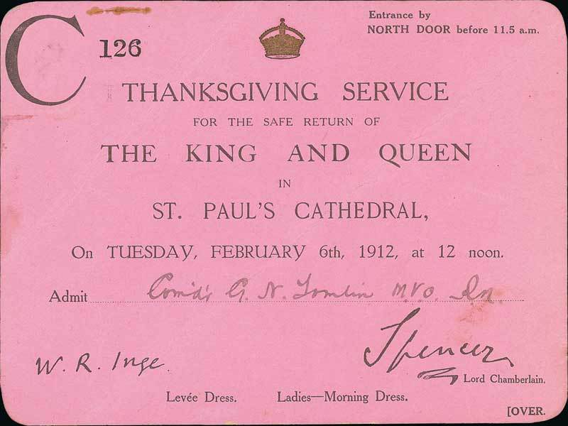 Thanksgiving Service, St. Paul's: Pink North Door ticket for Commander G. Tomlin (two diagonal creases) plus the Form of Prayer, fine. Photo