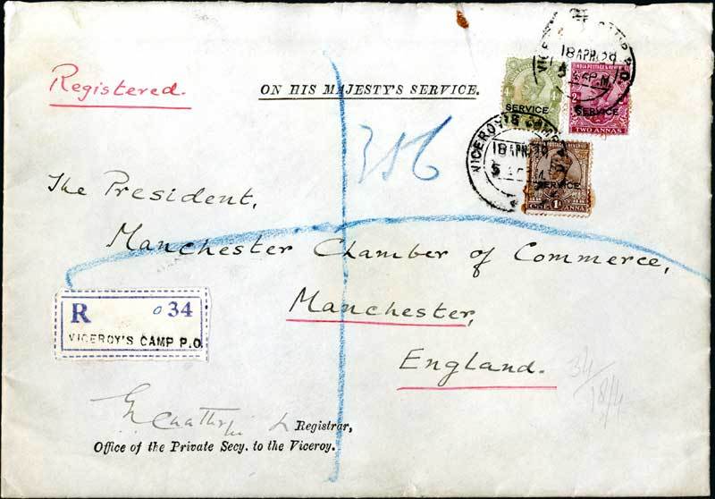 Lord Irwin (1926-31): 1929 (April) two typewritten letters on Viceroy's Camp, India letterhead, to the Manchester Chamber of Commerce. The first letter opens "It gives me much pleasure to receive your letter of 28th March by the first air mail from Great Britain to India ..."; the second letter is politely refusing an invitation to address the Manchester Chamber of Commerce; both double-page letter signed "Irwin" and each with the original O.H.M.S. envelope bearing Viceroy's Camp P.O. c.d.s. and special registration label. Fine and scarce. Photo