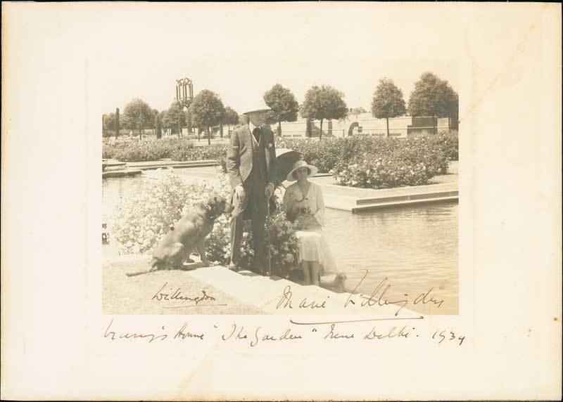 The Earl of Willingdon (1931-36): 1934 photograph of the Earl and his wife in the garden of the Viceroy's home in Delhi, signed "Willingdon" and "Marie Willingdon" with manuscript description below. Also 1937 New Year greeting with printed signatures, a photograph of the Marquess and Marchioness (6 x 8 inches) at the Indian Empire and Eastern Garden Party in July 1937 and another picture of the couple in a seated crowd. Photo