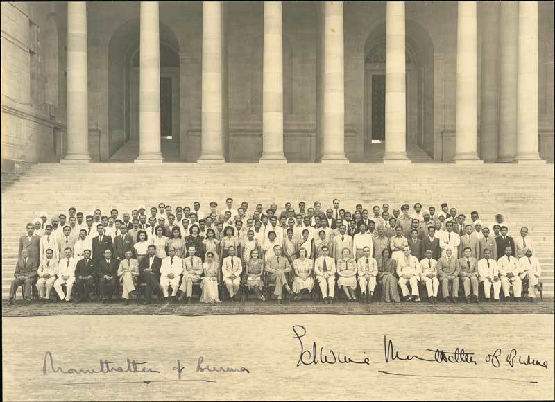 The Viscount Mountbatten of Burma (1947): A plate photograph (11 x 8 inches) of the Mountbattens with their staff, by Kinsey Bros., New Delhi and signed in ink, "Mountbatten of Burma" and "Edwina Mountbatten of Burma". Photo